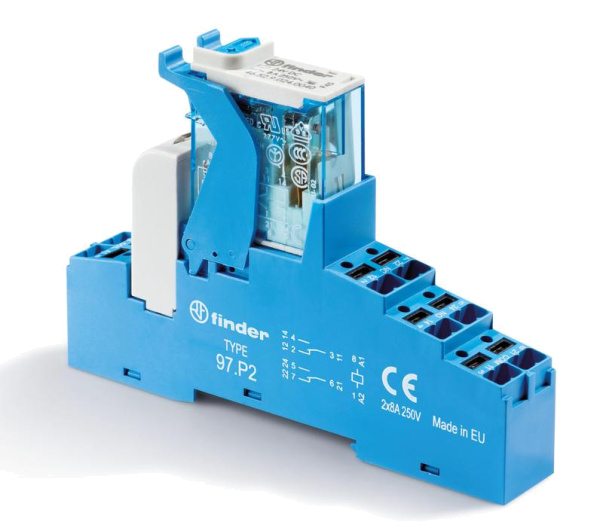 Модуль интерфейсный (сборка 46.52.9.012.0040 + 99.02.9.024.99 + 97.P2SPA) электромеханич. реле 2CO 8А AgNi 12В DC IP20 безвинт. клеммы Push-in пластик. клипса LED + диод кнопка тест + мех. индикатор FINDER 4CP290120050SPA