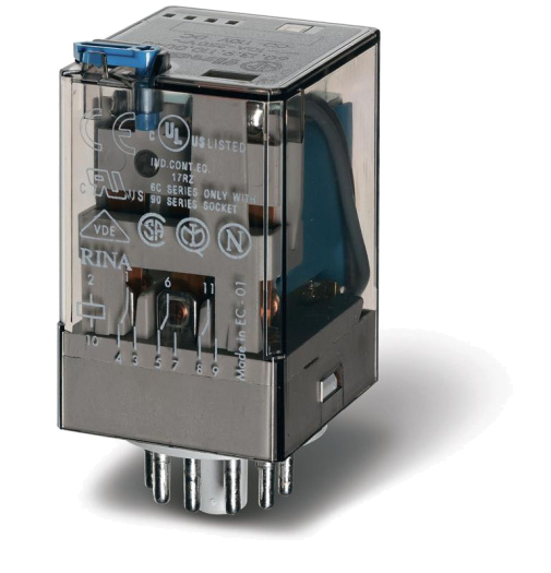 Реле универсальное электромеханич. монтаж в розетку 11-штырьковый разъем 3CO 10А AgNi 48В AC RTI опции: кнопка тест + мех. индикатор FINDER 601380480040