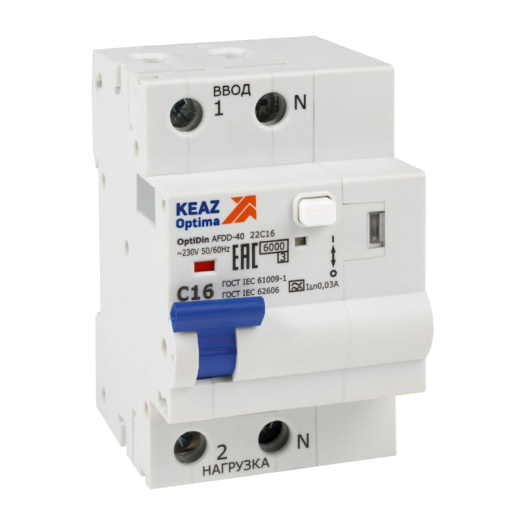 Устройство защиты от дугового пробоя с АВДТ и защ. от пов. напряж. OptiDin AFDD-40-22C16-A-У3 (2P C16 30mA Uоткл 275В) КЭАЗ 339086